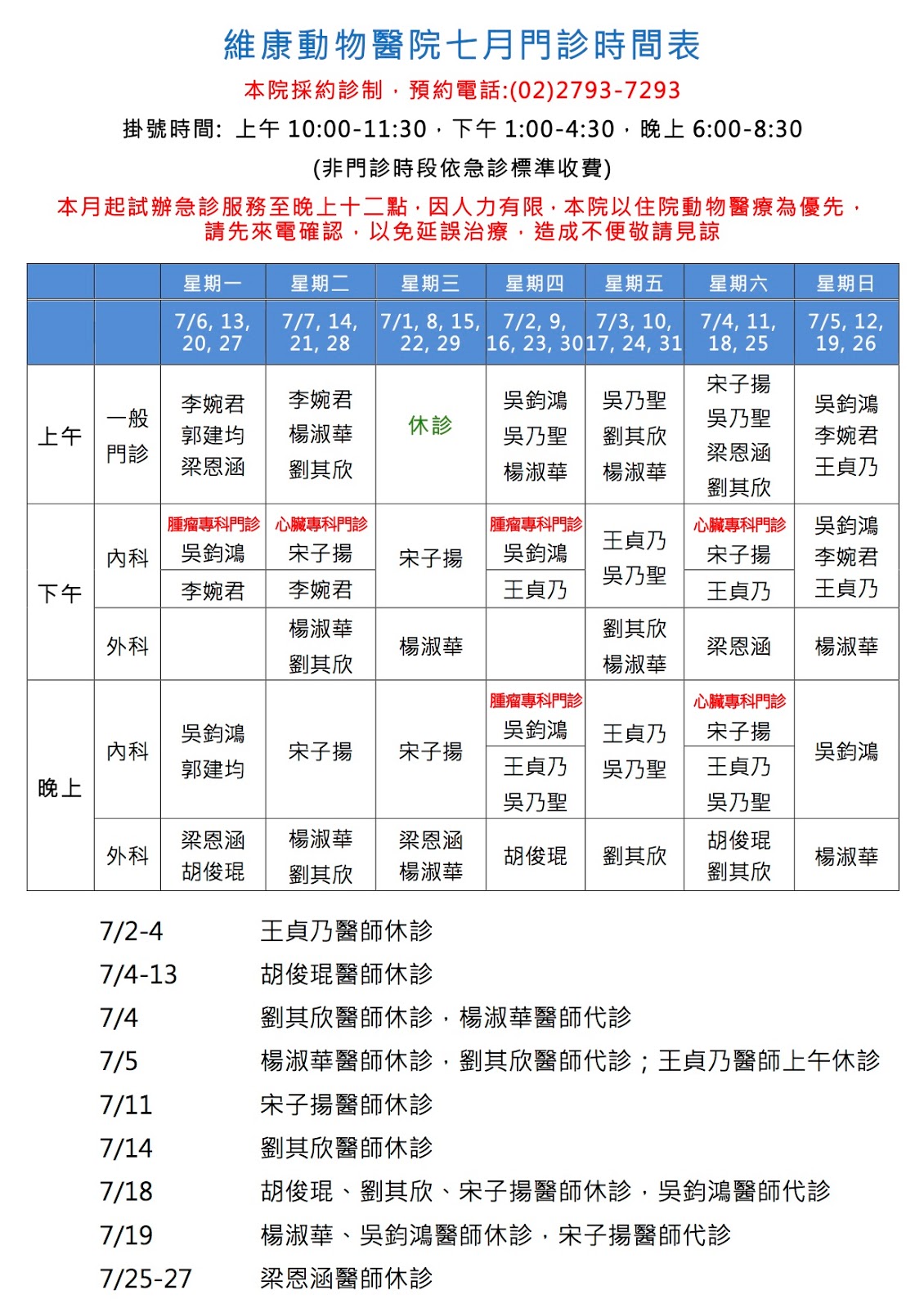 維康動物醫院官網已成立--門診時間表、聯絡方式...